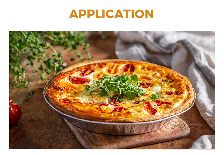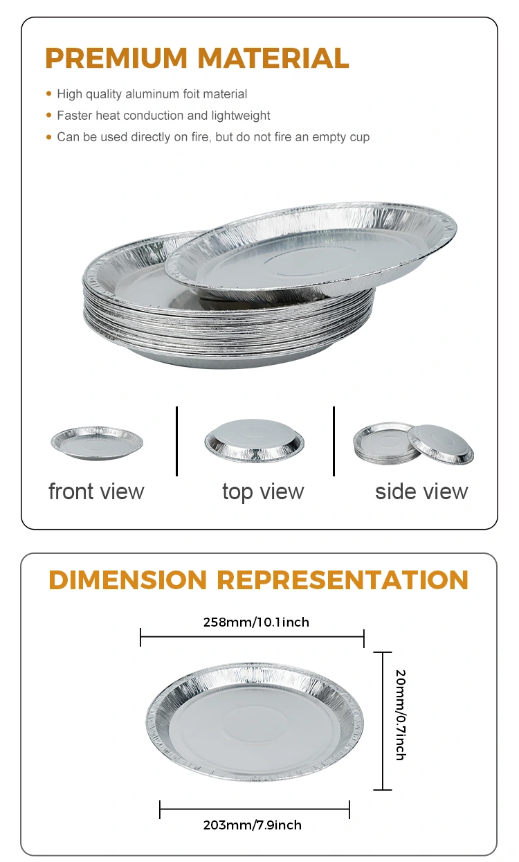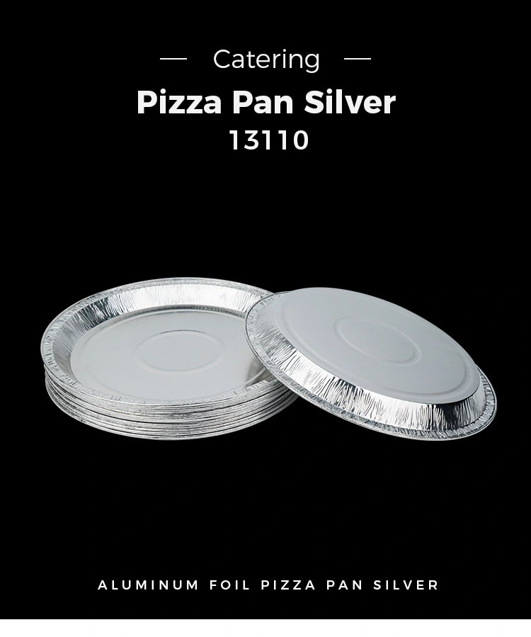 Yunchu Aluminum Paperak 10 hazbeteko pizza zilar aluminiozko paperezko edukiontziak eskaintzen ditu 13110 ereduarekin. Produktuak 258 mm-ko goiko diametroa du (10,1 hazbete inguru), 203 mm-ko diametro txikiagoa (7,9 hazbete inguru), eta 20 mm-ko altuera (0,7 hazbete inguru). Gutxi gorabehera 695 ml (24,5 ontza inguru) edukiera du. Gainera, altxatutako ertz diseinuak osagaiak isuri eta praktikotasuna areagotzen du. Logotipoen pertsonalizazio zerbitzuak ere eman ditzakegu, zure bezeroen inpresioa sakontzen laguntzeko eta zure markaren kontzientzia hobetzeko.
