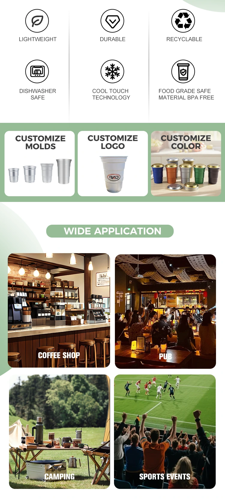 Merkataritza-jarduera-eszenatokiak: erakusketak, prentsaurrekoak, enpresa-te-atsedenaldiak eta beste zenbait ekitaldi. Aluminiozko edalontzi hau edariak gordetzeko erabil daiteke, hala nola, ur minerala eta ur txinpartatsua. Arina eta hartzeko erraza da, eta bere ezaugarri birziklagarria konpainiaren bulego berdearen irudira egokitzen da. Mini koktelak prestatzeko, whiskya eta abar edukitzeko tabernetan eta taberna garbietan erabil daiteke. Metalezko edalontziaren gorputzak hoztasuna azkar transmiti dezake, edarien izotz zaporea hobetu eta, aldi berean, diskoteka giroari modako estiloa gehitu.