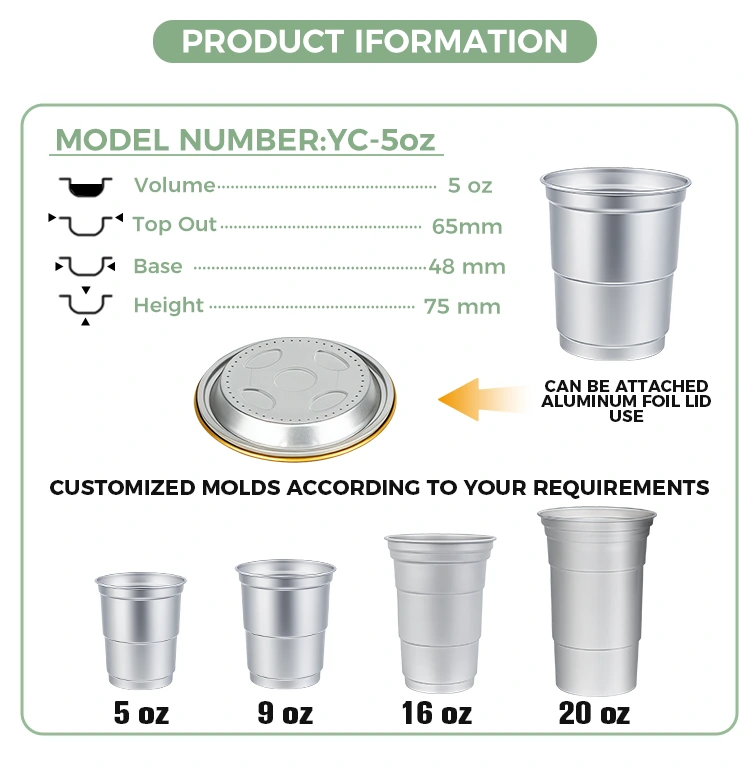 Yunchu aluminiozko paper hornitzailearen 5 oz botatzeko eta birzikla daitezkeen edari hotzak Aluminiozko edari edalontzia kalitate handiko aluminioz egina dago. Amaitutako produktuak ikuskatzeko prozesu zorrotza egiten dute substantzia kaltegarririk askatzen ez dela ziurtatzeko eta elikagaien kalitateko segurtasun-arauak betetzen dituztela ziurtatzeko, trago guztiak seguru eta kezkarik gabe egiteko. Kopako gorputzak luzatze prozesu zehatza hartzen du lodiera uniformea ​​eta indar bikaina lortzeko. Arina eta eramangarria da baina ez da erraz deformatzen. Abantaila praktikoak ditu eskuz edateko edo pilatutako biltegiratzeko erabiltzen den ala ez. Ijetzitako ertz diseinu berezia fin leundu da eta ertz leunak ditu errebarik gabe, eskuak urratzeko arriskua ezabatuz. Gainera, zigilatzea ona lortzen du eta ihesak eraginkortasunez saihesten ditu. Produktua birziklagarria da. Plastikozko edalontzi eta paperezko edalontzi tradizionalekin alderatuta, ingurumen-zama asko murrizten du eta ezin hobeto ezartzen du garapen berdea eta karbono baxuko kontzeptua.