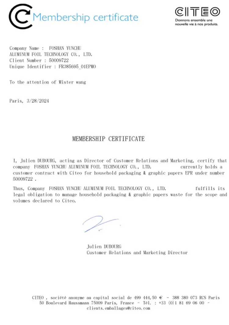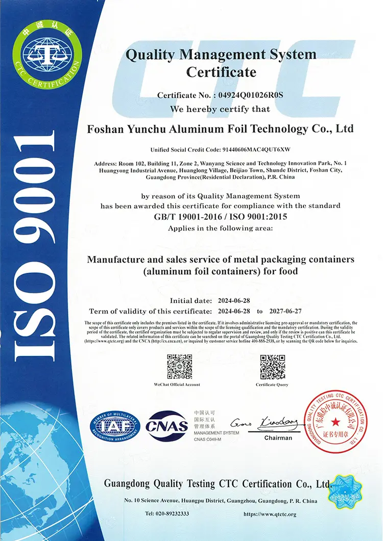 Foshan Yunchu Aluminum Foil Technology Co., Ltd. Nazioarteko kalitate estandarrei atxikitzen die. Gure produktuak lortu dira:
