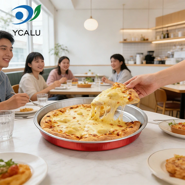 Yunchu aluminiozko paper hornitzailea C900 botatzeko pizza-zartaginaren ontzi biribila aluminiozko paperezko edukiontzia elikagai-mailako aluminiozko paper gordinaz egina dago, usainik eta ezpurutasunik gabe, janaria konfiantzaz ukitzea segurua delarik. Lodiera uniformea ​​eta solidoa da, eta tenperatura altuak 250 °C-raino eta tenperatura baxuak -20 °C-raino jasaten ditu. Pizza bero berria zuzenean zerbitza daiteke. Hoztu eta fresko mantendu daiteke ontzia aldatu gabe. Berotuz zuzenean jan daiteke, eta horrek asko hobetzen du janaria entregatzeko eraginkortasuna eta garbitzeko arazoak aurrezten ditu. Aluminiozko paperezko PET estalkiak ur-lurrunaren eta airearen sarrera modu eraginkorrean blokeatzen du eta koipe-ihesak saihesten ditu. Arku biribil klasikoa pizza-forma mota guztietara egokitzen da, 7 eta 9 hazbete bitarteko hainbat tamainarekin. Oso egokia da zehaztapen desberdinetarako, hala nola, eskuz egindako pizza, pizza italiarra eta lurrazal lodi amerikarra. Ez dago leku gehigarririk pizza irrista ez dadin eta gainak eror ez daitezen. Pieza bakarreko moldaketa-prozesuak forma egonkorra sortzen du, presioari eta talkari erresistentea da eta ez da erraz deformatzen edo hondatzen garraiatzeko garaian. Era berean, bere forma mantendu dezake pilatuta eta gordetzen denean, erraz hondatzen diren eramateko bilgarrien mina erabat konponduz eta pizza bakoitza egoera onean entregatzen dela ziurtatuz.