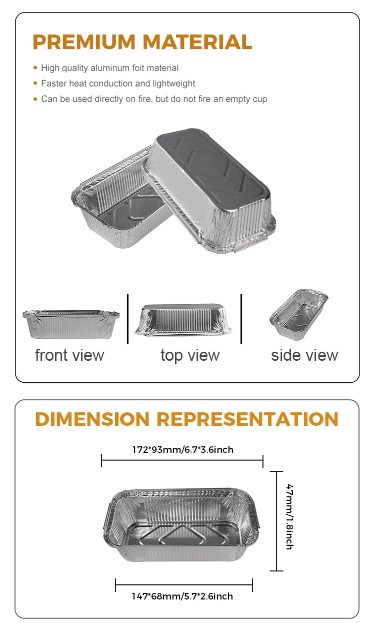 Zilarrezko aluminiozko gozogintza laukizuzenak. Edukiontzi hau nahiko trinkoa da, askotariko lapiko eta ekipoetara egokitzeko, eta hainbat tamainatan sartzen da sugar irekiko barbako desberdinen beharrak asetzeko. Elikagai produktuak egiteko erabil daiteke, hala nola, aire-fryers eta bestelako ekipamenduko aplikazioak, bero eta olioarekiko erresistentzia, labean erraza.