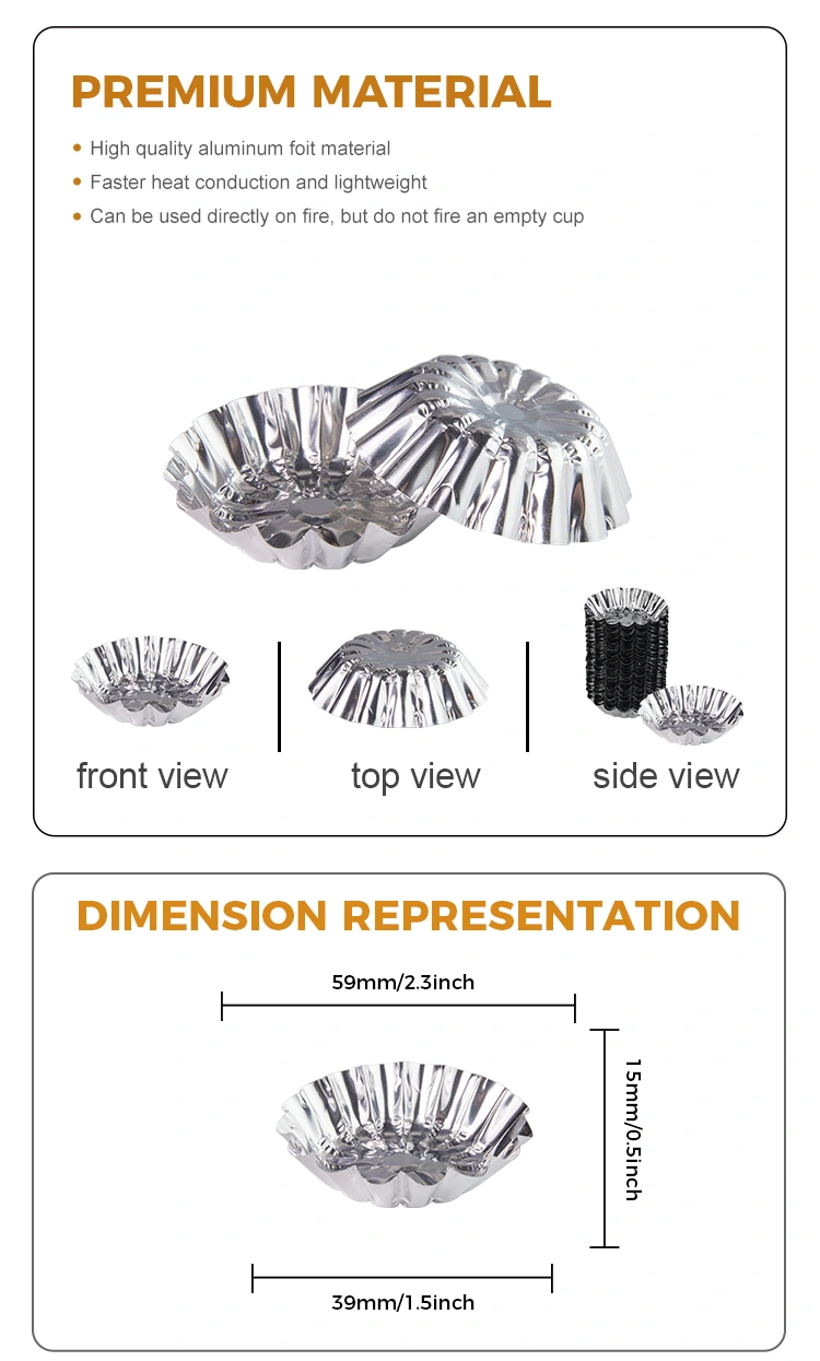 Yunchu Aluminum Paperezko Hornitzaileen Arrautzak Zilarrezko Aluminiozko Paperetako Elikagaien Elikagaien edukiontzian, marruskaduraren aurkako patroiak ez du minik egiten, kurbatutako kopa ahoaren diseinua, behin-behineko erabilera, erabilera zabala, eggeko tarta, pastelak, arrautza gorringoak erabil daitezke. Crisps, katilu pastelak eta bestelako jakiak. Yunchu-k Alemaniako ERP ziurtagiria, EBko SGS ziurtagiria eta ISO9001 Kalitatea Kudeatzeko Sistemaren Ziurtagiria gainditu ditu. Elikagaien kalifikazio material osasuntsuak eta ingurumena erabiltzen dugu gure produktuen segurtasuna eta toxikotasuna bermatzeko. Material horiek berriztagarriak ez ezik, ingurumenarekiko errespetuak ez ezik, elikagaien segurtasunean gure eskakizun zorrotzak eta gure produktu orokorrerako kalitate handiko estandarrak lortzeko konpromisoa islatzen dute.