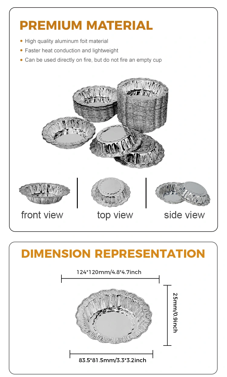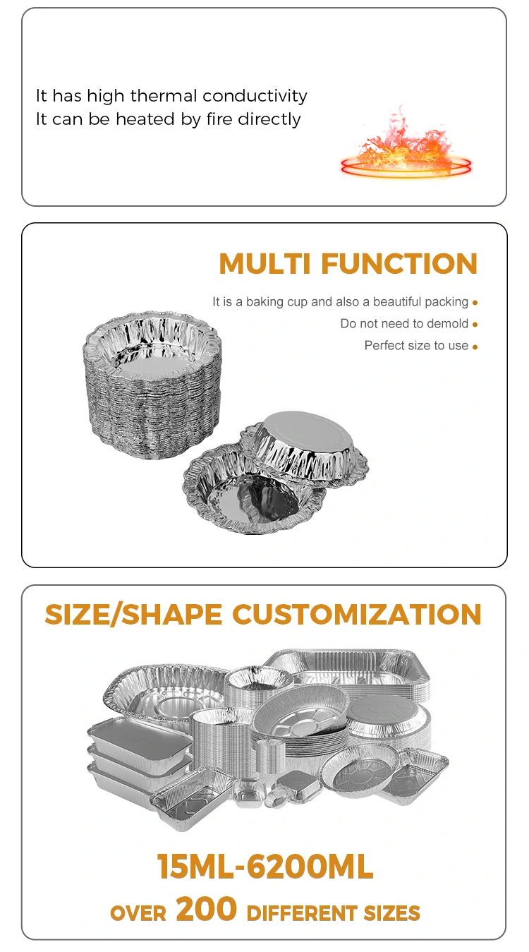 Yunchu Aluminum Paperak parpailak gozogintza pastela eskaintzen dizu Zilarrezko aluminiozko paper ontziak polifazetikoak dira labean eta lurrunetarako. Erabilera anitzetarako diseinatuta dago, pastelak, katilu pastelak eta beste hainbat jaki egiteko gai da. Boteragarria da, ez da garbiketa beharrik, eta -30 ℃ 250 ℃ bitarteko tenperatura altuak jasan ditzake, ez erretzea edo apurtzea. Kalitate handiko, elikagaien kalifikazio eta ingurumenarekiko materialekin egina, substantzia kaltegarririk gabe erabiltzea seguruagoa da. Kalte, sendoa eta iraunkorra da, tentsio indarra eta luzapen ona ditu, ertzak leunak dira, mozketak ekiditeko. Askotariko beharrak asetzeko hainbat zehaztapen daude.