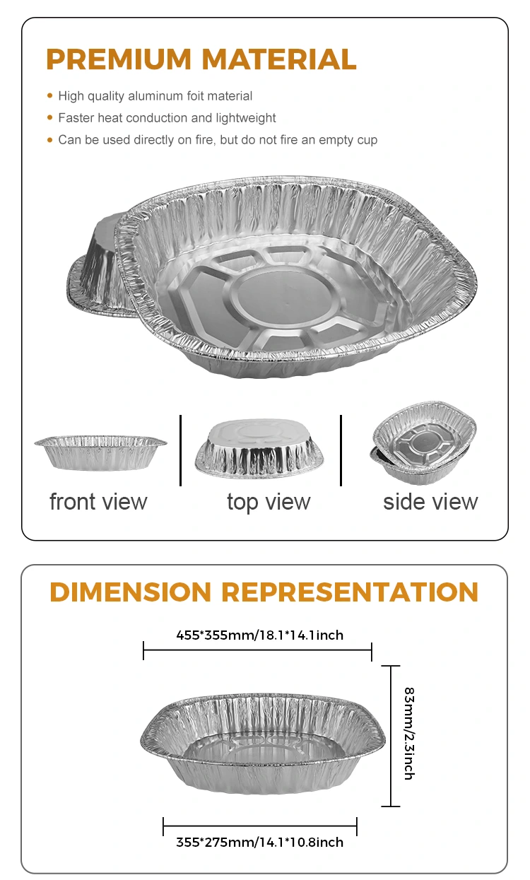 Yunchu aluminiozko papera handizkako oilasko parrilla parrilla. Zilarrezko aluminiozko paperezko edukiontziak, jatetxeen, jatetxeen aurrefabrikatuen, jatetxeen hoztearen eta konpainiaren afariek ere egokiak izan daitezke. Produktuak ekipamendu berogailua lagun dezake, berehala berotu eta erabili ahal izango da Kanpoko eta beste eszenatoki batzuetan, egitura orokorrak gogortzaileak eta ohiko forma konkretuaren eta forma konbinatzen ditu, bere iraunkortasuna eta segurtasuna bermatu ahal izateko.