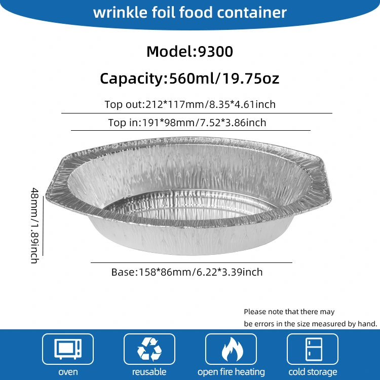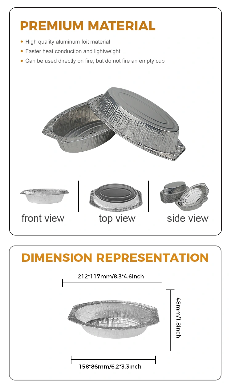 Yunchu Aluminum Paper hornitzaileak ogi obalatua eskaintzen du ogi labean zilarrezko aluminiozko paperezko edukiontziak etxeko sukaldaritza, okindegiak, kate dendak eta hoztutako janari entrega. Elikagaien aluminiozko paperezko materialetatik landua, edukiontzi honek zilarrezko labean dauden askoren artean nabarmentzen duen forma obalatua du. Edukiontzi hau bereziki egokia da zapi beroak, fruituak, ogia eta era guztietako erretratuetarako elikagaiak edukitzeko, eta mahai-jantzi sorta zabal baten beharrak asetzeko. Eroankortasun termiko ona dela eta, tenperatura altuak modu berdinean xahutu ditzake, janaria modu berdinean berotzen dela ziurtatuz. Gainera, karga-gaitasuna eta presioarekiko erresistentzia jakin bat du, egonkortasuna mantenduz pila anitzen kasuan ere, deformazioa prebenitzea eta garraioan erabiltzeko aproposa da. Eszenatoki eta behar desberdinetara hobeto moldatzeko, edukiontzi hau bezeroaren eskakizunen arabera ere pertsonaliza daiteke eta praktikotasun gehiagorako parekatutako estalkiak eskaintzen ditu.