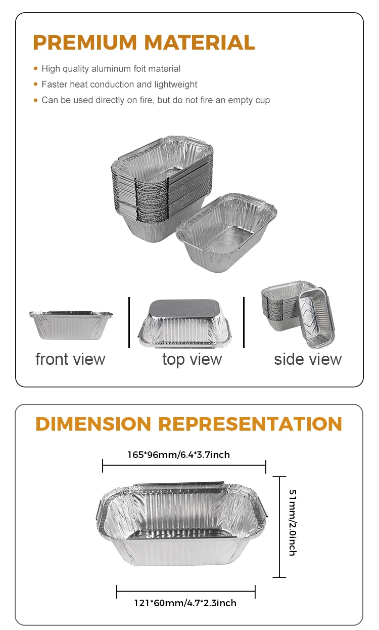 Ezaugarriak: Aluminiozko Paperaren Bazkaria Bazkaria 8011 aluminiozko paperezko materialaz osatuta dago, bero kontserbazio errendimendu bikaina du eta janariaren tenperatura modu eraginkorrean mantendu dezake. Bereziki, gure arroza zuritutako arroza zintzilikatutako aluminiozko paperezko edukiontziak isolamendu-propietate termikoak ditu, baina aluminiozko paperezko estalkiekin edo maskotarako plastikozko estalkiekin ere konbinatu daitezke logotipoak pertsonalizatzeko pertsonalizatua errazteko, eta horrela bezeroen memoria puntuak hobetuz eta markaren kontzientzia hobetzeko.