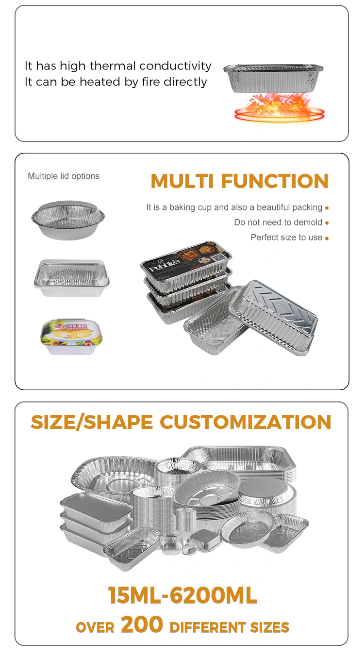 Yunchu aluminiozko paperezko hornitzailea, zilarrezko aluminiozko paperezko edukiontziak, barbakoa, pote beroa, gozogintza, janari ontziak. Hainbat tamaina aproposak dira lapiko eta etab., Sugar irekiko barbakoa eta abar. Ekipoen aurkako beste aplikazio batzuk, bero eta olioarekiko erresistentzia erraza, kanpoko barbakoa, aldi baterako ontziak ez dira beldurrik, janaria edo zopa jarri behar izanez gero, ez lehortu urik gabe, etxeko labeak garbiak eta komenigarriak dira platerak botatzeko.