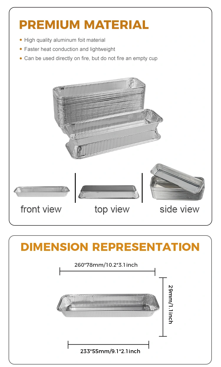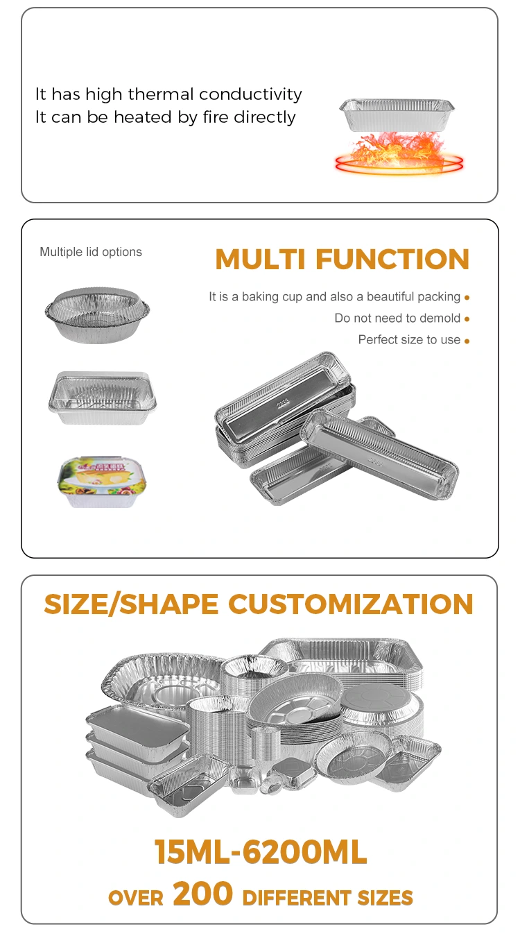 Ezaugarriak: Bazkariko kutxa handizkako 8011 aluminiozko paperezko materialaz egina dago, bero kontserbatzeko efektu ona du eta janariaren tenperatura mantendu dezake, janaria gozoagoa eta goxoa bihurtuz. Horrez gain, gure bbq zilarrezko aluminiozko paperezko edukiontziak bero isolamendu funtzioa ere badu eta aluminiozko paperarekin eta maskota plastikozko estalkiarekin bat egin daiteke.