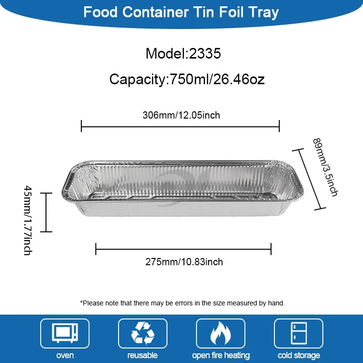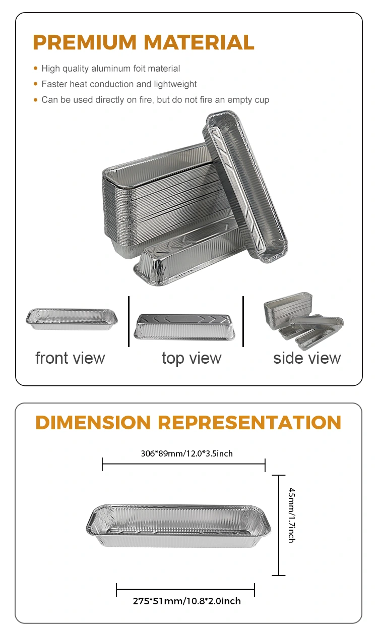 Zilarrezko aluminiozko paperezko hotzak ogi laukizuzeneko aluminiozko edukiontziak kalitate proba zorrotzak jasaten ditu, substantzia kaltegarririk ez dela askatzen sugar irekiko berogailuan, eta erabiltzaileek ez dute segurtasun arazoengatik kezkatu behar. Gainera, bere diseinu ekologiko eta iraunkorrak produktuen garraio segurua bermatzeaz gain, itxura onena mantentzen du. Beheko diseinu konkistatu eta konbexuak produktuaren aurkako irristagaitza propietateak hobetzen ditu, eta alboetako zurruntasun ergontzaileek produktuaren gogortasuna areagotzen dute. Hemming diseinua loditzen eta sakontzen da, tenperatura altuko erresistentzia ona eta eroankortasun termikoa, berogailu uniformea ​​eta usainik gabekoa lor dezakeena, oso egokia da eszenatoki anitzetan erabiltzeko, esaterako, ikatz-parrilla, ogi luzea eta eramateko entrega.