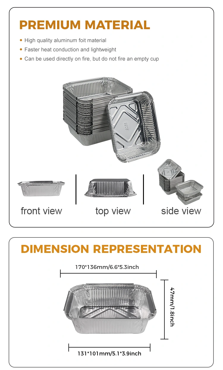 Yunchu Aluminum Paper hornitzailearen materiala Gratin angeluzuzeneko ontziak Zilarrezko aluminiozko paperaren edukiontzia bikaina da, kalitate handiko aluminiozko paper materiala erabiliz, arina eta iraunkorra baita. Goikoa maskota edo aluminiozko paper estalkia dago, eta beheko aldean estalki bat da eta alboko kaxan finkatuta dago, janariaren segurtasuna eta higienea bermatzeko. Ezaugarri fisiko fidagarri hauek eta erabilerraza diseinatzeko moduak eramateko lehen aukera egiten dute.