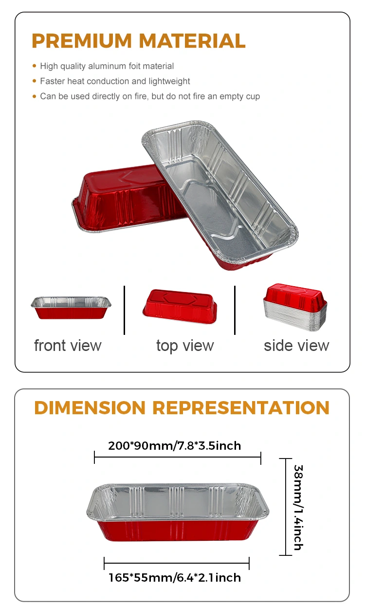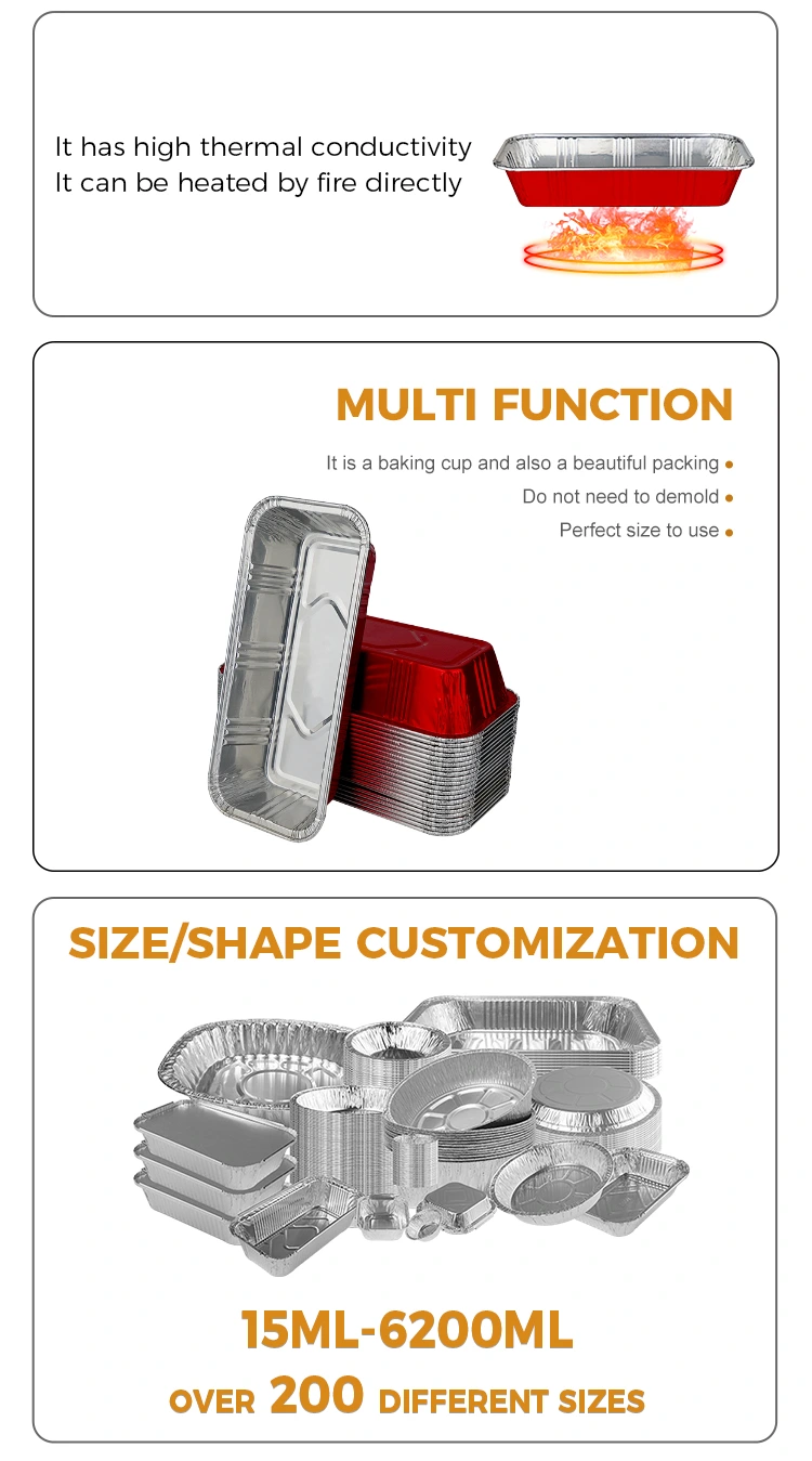 Yunchu aluminiozko paperak kalitate handiko okindegi gorri angeluzuzenak eskaintzen dizkizu Zilarrezko aluminiozko paperezko ontziak, iraunkorrak eta beroarekiko erresistenteak izateko diseinatuta daudenak, beroa modu uniformean eroan dezakete ikasketa saihesteko eta zigilatze sendoa dute fresko mantentzeko.