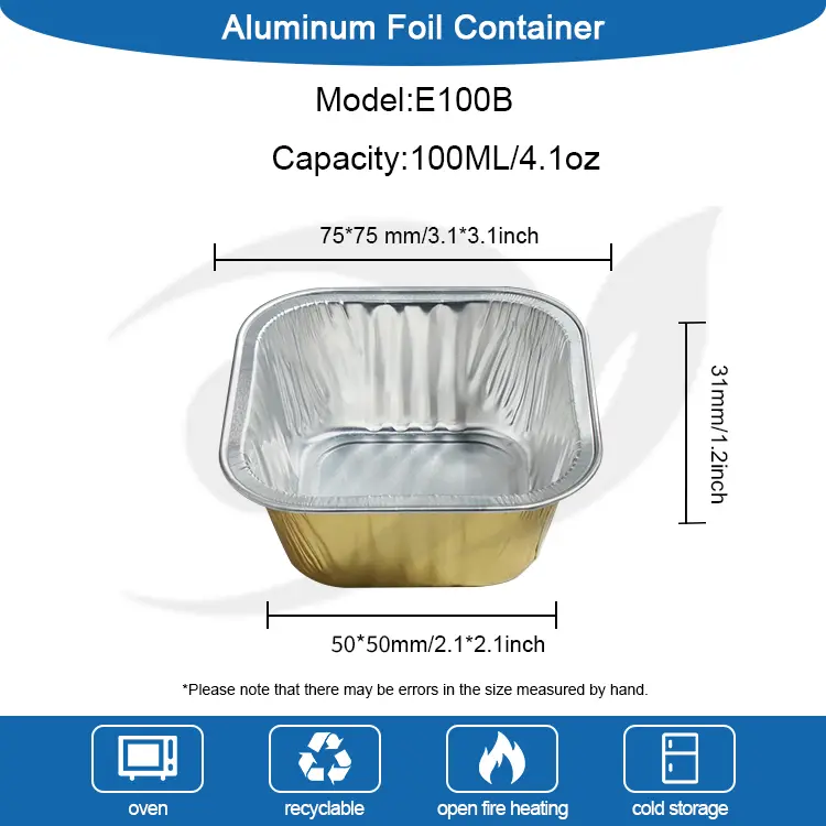 Square gozogintza pastelak Aluminiozko paperezko edukiontziak E100b-ek goiko diametroa du 75 * 75mm-ko (2,9 * 2,9 hazbeteko). Eraman, egitura sendoa da, ez da erraza deformatzen, irristakorra eta ihesak. Zuzenean berotu daiteke, platerak eta platerak berriro ordezkatzeko eta produkzioaren eraginkortasuna hobetzeko arazoak izan ditu.